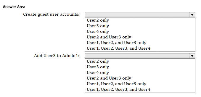 The tenant includes a security group named Admin1. Admin1 will be used to manage administrative accounts. External collaboration settings have default configuration.